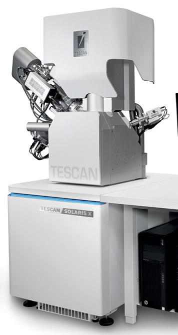 A Plasma FIB-SEM platform for deep sectioning and the highest resolution end-pointing for package level failure analysis • Curtaining-free large-area cross-sectioning for physical failure analysis of advanced packaging technologies • Prepare large area FIB-cross-sections up to 1 mm wide • Obtain low noise, high-resolution image at low keVs in short acquisition time at FIB-SEM coincidence with the sample tilted • Live SEM-monitoring during FIB milling for precise end-pointing • Observe the most beam-sensitive materials using low keVs ultra-high resolution for surface sensitivity and high material contrast • Effective techniques and recipes for fast and artefact-free cross-sectioning of composite samples (OLED and TFT displays, MEMS devices, isolation dielectrics) at high currents • Essence? easy-to-use modular user interface Complement TESCAN Solaris X capabilities with stand-alone laser ablation, which significantly improves time-to-result for large volume milling or access to deeply buried regions of interest, and frees the Plasma FIB for final targeted material removal, sample thinning or cross-section polishing. |